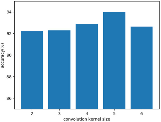As can be seen from Figure 5, under the premise of an unchanged number of channels, with the increase in convolution kernel size, the accuracy of network identification first increases and then decreases. When the convolution kernel size is 5, the network has the best recognition ability, so the convolution kernel size is 5.