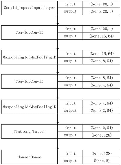 Among them, the input in the input layer is a 20-dimensional feature vector; the output of Conv1d is 16, obtained by formula (9), and the output of Maxpooling1d is 8, obtained by formula (12). After that, a pair of convolutional layers and pooling layers are calculated the same.