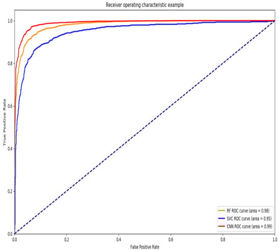 Malicious URL classification using SVM and random forest models. The ROC curve is obtained by calculating TPR and FPR through formula (16) and formula (17). As shown in Figure 8, the AUC of SVM is 0.95, the AUC of random forest is 0.98, and the AUC of the CNN model used in this paper is 0.99. It is concluded that the prediction results of this model are valuable and better than other models.