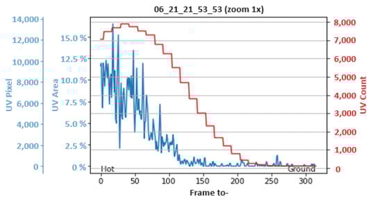 The sum of each red pixel in the segmented image gave the UV emission area. The result was then divided by the cropped image resolution according to the selected zoom value, so the calculation result was independent of the zoom level of the recorded video since the measurement window on the camera screen became smaller when the zoom value was increased. The final calculation result was the ratio between the UV pixel total and the cropped image resolution, as shown in (15). The final calculation result was then multiplied by 100 (%) to obtain the results in percentage units.