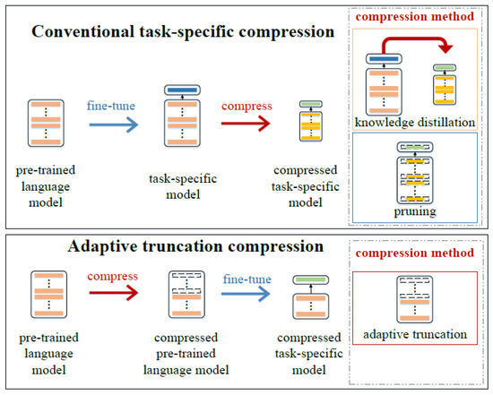 Contemporary task-specific compression methods fall into four categories: quantization, pruning, distillation and matrix decomposition [8,16,17,18]. Among them, distillation and pruning are perhaps the most used. The general procedure of these two kinds of methods is illustrated in Figure 1 (upper box). (Note that pruning methods commonly require fine-tuning again after model compression, which has been omitted in Figure 1 due to this process being very simple and rarely mentioned in the literature.) As shown, knowledge distillation implements compression via transferring knowledge from a large teacher to a much smaller student, whereas the pruning methods finish compression based on one model. There exist two common weaknesses of these methods: First, they reduce the calculations needed in the inference stage at the cost of a much longer training time (fine-tuning and compressing). In fact, the resources consumed by fine-tuning are often prohibitive of the application of these methods [6,7]. Second, few of them consider the complexity of downstream tasks, as well as how the language models and target tasks correlate, when determining the architecture of the student model or the units in the language model to be pruned.
