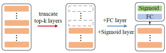 As illustrated in Figure 3, a model for BTC can be built via truncating BERT in two steps: The first step is to drop the top-k Transformer layers from the pre-trained BERT and preserve the bottom part as an encoder. The second step is to add a task head to the top of the resulting encoder, composed of a fully connected (FC) layer and a sigmoid layer to construct a binary classifier. In this way, when ranges from 11 to 0, we obtain 12 different classifiers, which are denoted by ,…, , respectively. To train such a classifier , the parameters in different parts are initialized differently: those in the encoder, i.e., the bottom Transformer layers retained, are initialized using their weights learned in pre-training, whereas those in the task head are randomly initialized. After that, is fine-tuned using labeled datasets of downstream BTC tasks.