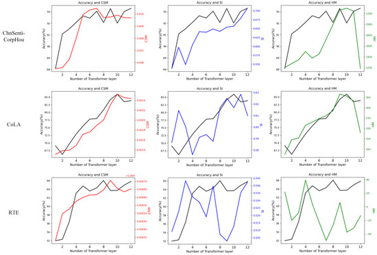 The test accuracy (black) vs. CSM (red), SI (blue) and HM (green) curves on 3 BTC datasets. We juxtapose the separability index and classification accuracy for all 12 Transformer layers. The horizontal axis is the layer index of BERT, the left vertical axis is the classification accuracy and the right vertical axis is the separability index. Each row corresponds to a different dataset, and each column corresponds to a different separability index. Best viewed in color.