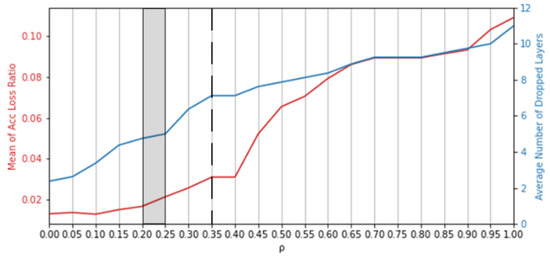 The mean accuracy loss ratio (the left vertical axis) and the number of dropped Transformer layers (the right vertical axis) vary when changes from 0 to 1 with a stride of 0.05. The horizontal axis is the value of . The vertical dashed line corresponds to the upper bound of that can bring good trade-offs between accuracy loss and compression ratio. The gray interval corresponds to , which can achieve the largest compression ratio without notable accuracy loss. Best viewed in color.