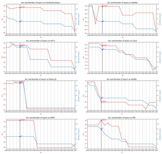 The test accuracy (left vertical axis) and number of Transformer layers preserved in the truncated model (right vertical axis) vary when changes from 0 to 1 with a stride of 0.05. The horizontal axis is the value of . Each subplot corresponds to a different dataset. The vertical dashed line in each subplot corresponds to = 0.20. Best viewed in color.