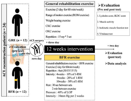 The present study design is illustrated in Figure 2. All participants underwent a pre-test, a 12-week rehabilitation exercise program and a post-test. After the participant’s ACL rupture had been identified by an orthopedic surgeon, pre-tests were conducted. The pre-test was completed 1 day before the ACL reconstruction, and the post-test was conducted 2 days after the last rehabilitation exercise program. On the test day, all participants visited the Sports Medical Center at M Hospital and were tested after stabilization. All participants visited the rehabilitation center at M Hospital three times a week for 12 weeks and performed GRE and BFR exercises with a trainer supervision for a total of 60 min. The GRE group conducted a general rehabilitation exercise, and the BFR group conducted a BFR exercise along with the general rehabilitation exercise. Before and after the 12-week rehabilitation exercise session, all participants underwent anthropometry (i.e., height and weight) and the Lysholm score and the IKDC subjective score was determined, as well as muscle activity (e.g., quadriceps femoris), isokinetic muscular function (e.g., strength and endurance) and balance (e.g., Y-balance anterior, Y-balance posterior medial and Y-balance posterior lateral). All measurements were conducted at the rehabilitation center of M Hospital, and the room temperature and humidity were maintained at 23 ± 2 °C and 50 ± 5%. All patients came to the hospital between 9:00 and 10:00 a.m. to have their measurements taken. As for the measurement clothes, short-sleeved shirts and shorts provided by the rehabilitation center at M Hospital were worn.