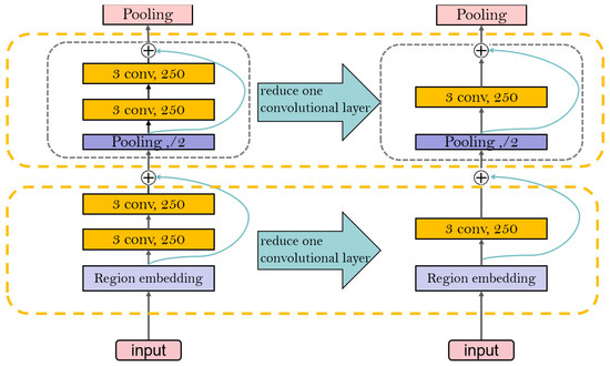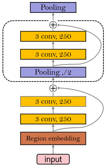 After the text is input, it passes through a region embedding layer containing three different convolutional feature extractors, then two layers of equal-length convolution. Finally, the text is repeated through a residual block of half pooling, which continuously improves the semantics of the text and makes the extracted features richer. The structure of the DPCNN is shown in