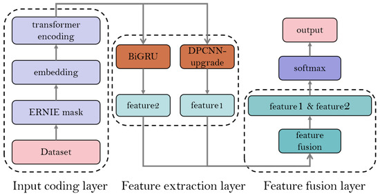 EGC is divided into four parts, consisting of an input coding layer, a feature extraction layer, a feature fusion layer, and Softmax activation. At the input encoding layer, the input text is masked by ERNIE, embedded, and finally fed into the transformer for encoding. The encoded text is then fed into the feature extraction layer, which feeds the data into the DPCNN-upgrade and BiGRU modules for feature extraction. The extracted features are then fed into the feature fusion layer, where they are stitched together and fused into new features. The stitched features are then classified using Softmax, in order to obtain the final result. The EGC structure is shown in
