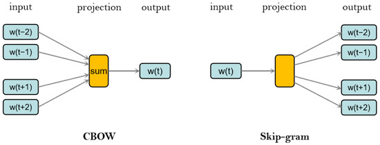 36] and provides a more efficient means of representing semantic distances between words through a deep learning-based tool that obtains a vector representation of each word in a corpus by calculating the cosine distance between word vectors. Word2Vec consists of two word vector training models, CBOW and Skip-gram, both of which include an input layer, a projection layer, and an output layer. The CBOW model predicts the current word from its context, which is suitable for use with a smaller data set; therefore, in this paper, we use the CBOW model. In contrast, the Skip-gram model predicts the current word in context. The structures of these two models are shown in