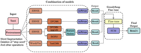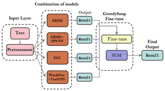 First, in the input layer, the text is fed into the pre-treatment module for pre-processing. The pre-processed text is then fed into the combination of models, consisting of all four models (i.e., ERNIE, ERNIE + DPCNN, EGC, and Word2Vec + TextCNN), each of which outputs a result to the next stage. In the GreedySoup Fine-tune stage, the outputs of the four sub-models are weighted using the GreedySoup weighting strategy, which is carried out to obtain a matrix containing information on the weights of each category. Finally, in the final output stage, the category with the highest weight is selected as the final output.
