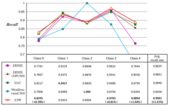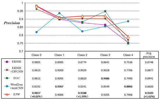 In summary, E3W proposed in this paper is obtained by combining several models that perform well in different categories of the data and adjusting the weights of the models, which provides a feasible and effective modelling approach. In comparative experiments with 13 models, the four models that performed best in different categories of the data set were selected; these four models were ERNIE, ERNIE + DPCNN, EGC, and Word2Vec + TextCNN. Glove essentially involves the dimensionality reduction of a matrix; however, certain attributes are naturally lost in the process of dimensionality reduction. As agricultural text titles are inherently short, have limited information, and cover many categories, this can easily lead to some information being lost through dimensionality reduction, making it difficult to correctly classify. Based on the above reasons, we chose to combine word2vec with TextCNN.