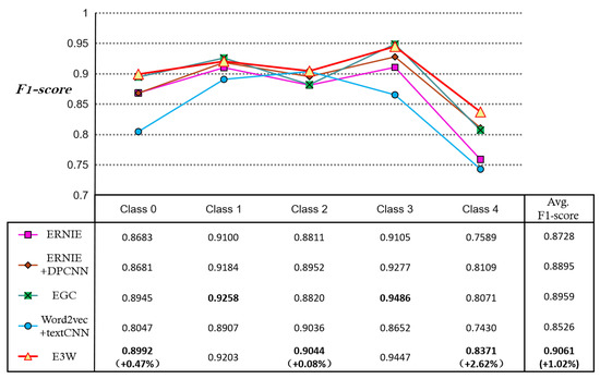 Table 5, we obtained four sub-models with excellent classification results: ERNIE, ERNIE + DPCNN, EGC, and Word2Vec + TextCNN. We combined these four high-performing models to obtain the proposed E3W model. Then, we evaluated these five models, in terms of accuracy (ACC), precision (P), recall (R), and F1-score (F1), in order to evaluate their effectiveness and conducted relevant ablation experiments, the details of which are provided below.