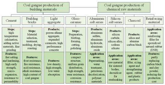 Extensive theoretical and practical explorations of coal gangue recycling to prepare building materials and chemical raw materials have been conducted worldwide. Because of the high content of SiO2, Al2O3, and Fe2O3 [16], coal gangue has been used for manufacturing building materials, such as cement [17,18], bricks [19,20], lightweight aggregate concrete [21,22], and glass-ceramics [23]. Coal gangue, rich in Si, C, and Al, is also used to develop aluminum salt chemicals [24,25], silicon salt chemicals [26,27], carbon chemicals [28], and reinforcing materials [29]. Coal-producing countries keep developing and deepening the utilization of coal gangue on the ground, as shown in Figure 1.