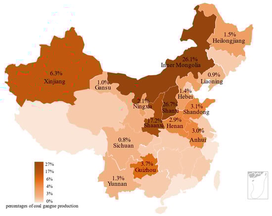 Coal resources in Eastern China are being gradually exhausted, and their potential for coal production growth is limited. Considering that Eastern China is densely populated and built-up, its coal mining mostly occurs under buildings (structures), railways, and water bodies, which is becoming increasingly difficult. Large coal mines are mainly located in Middle and Western China, where coal production and the demand for coal gangue disposal has been growing [87,88,89,90,91]. For example, the annual amount of coal gangue at the Daliuta coal preparation plant of the Shandong Coal Group reached 5.10 million tons and at the Buertai Coal Mine it was approximately 3 million tons. At present, utilization and disposal technologies can hardly handle such a large amount of coal gangue efficiently.