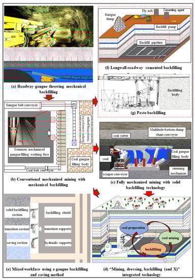 - The existing underground gangue backfilling technologies include: mechanical backfilling, fully mechanized mining with solid backfilling technology, mixed workface using a gangue backfilling and caving method, longwall-roadway cemented backfilling, and paste backfilling. These technologies are mainly applied to coal mining under buildings (structures), railways, and water bodies in Eastern China. However, they have quite limited gangue disposal capacity due to inadequate equipment and low automation;