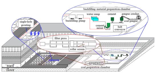 Fully mechanized mining with solid backfilling technology [60,61,62] (Figure 4c) is a suitable method for coal mining under buildings (structures), railways, and water bodies. The gangue produced by underground coal mining is initially crushed mechanically and then transported to the working face for in-situ backfilling. The filling materials in the goaf are compacted by the ramming mechanism [63,64]. The integrated underground mining-dressing-backfilling technology that combines solid backfilling mining and underground gangue dressing has appeared in response to China’s policies of green mine construction and to accommodate deep coal resources [65]. On this basis, the technical concept of “mining, dressing, backfilling + X” integrated green mining (Figure 4d) has been proposed. The “X” consists of active control for strata movement, gob-side entry retaining, gas extraction, disaster prevention and control, and water conservation mining [66,67,68].