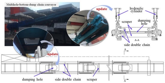 Several models of the multihole-bottom-dump chain conveyor have been designed, including SGBC630/150, SGBC764/250, SGBC764/300, and SGZC764/250 [95,96,97,98]. However, the existing multihole-bottom-dump chain conveyors generally have the deficiencies of low transport capacity, high accident rate, and low reliability. They generally fail in the task of disposing of a large amount of coal gangue. Multihole-bottom-dump chain conveyors have a low transport capacity, with a small dumping hole that is less optimized in shape, resulting in a limited dumping amount. They may bend, twist, or even rupture due to the hanging method and the multihole-bottom-dump chain conveyor may be clogged by coal gangue, leading to a rupture and a high accident rate. Therefore, the available multihole-bottom-dump chain conveyors can hardly satisfy the coal gangue requirements.