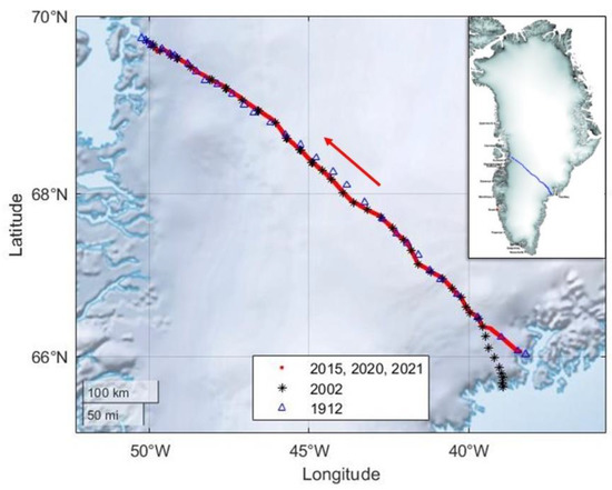 - Riffeler, M. Eishöhenänderung in Grönland zwischen 1912 und 2010. Master’s Thesis, Beuth Hochschule für Technik Berlin, Berlin, Germany, 2012. [Google Scholar]