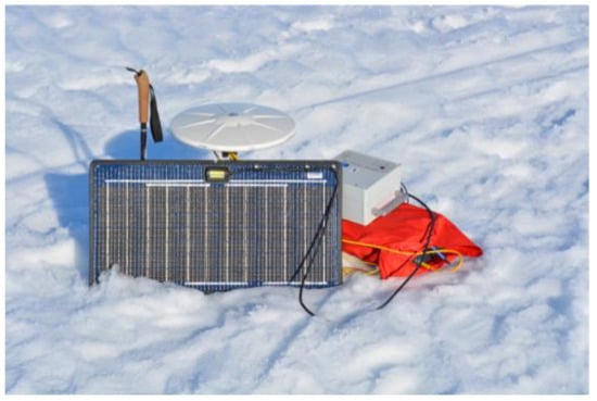 Static GNSS measurements were taken approximately every 20 km at the respective overnight camps in 2002, 2006, 2010, 2012, and 2015, with each expedition member reaching the camp established in 2002 to ensure comparability. Upon arrival, the antenna was set up, aligned, and connected to the receiver (see Figure 3). The system is powered by solar cells. The measurement time is between 8 and 12 h, and the equipment is stored at a sufficient distance to avoid interference with the signal. The earlier measurements were made using ground stations on both coasts (Kangerlussuaq and Kulusuk and Tasiilaq, Kangerlussuaq and Ilulissat, respectively), and later, precision was achieved using Precise Point Positioning (PPP) by correcting the orbits afterward. WGS84 was used as a reference frame.