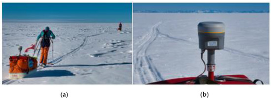 Kinematic GNSS measurement during GKE 2020 (a) on the pulka. (b) Trimble R12.