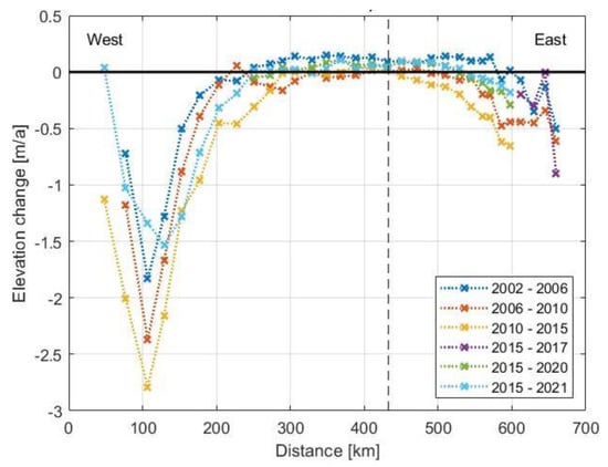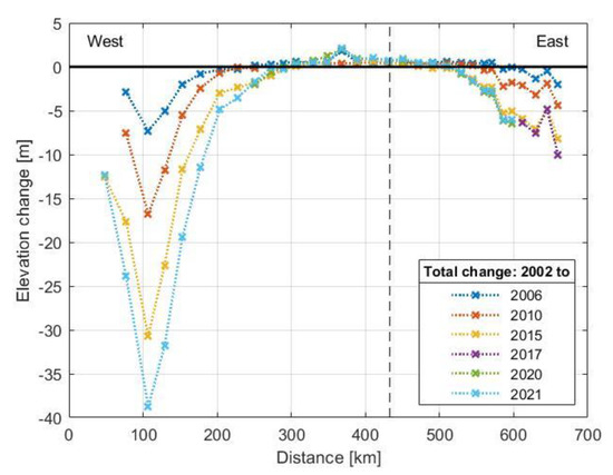 The catchment areas of the two glaciers Helheim (East coast in Figure 5) and Ilulissat Isbræ (West coast in Figure 5) are clearly visible. The watershed is located at km 420 (in Figure 5) and represents the highest point along the route. The 2002, 2006, 2010, and 2015 measurements seem to indicate an acceleration of mass loss, but the 2020/21 measurement does not confirm this. It appears that longer time series are needed to identify more reliable trends.