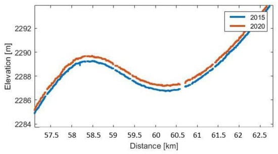 The NASA IceSat satellite (Ice, Cloud, and land Elevation Satellite, 2003–2010) data were used. Comparing the profiles measured in this project with an elevation model derived from IceSat data [29], the qualitative difference between the two data sets becomes clearly visible (Figure 16). The elevation model is from 2010, based on the end of the IceSat mission and shows considerable deviations from the profile measurements due to the different spatial resolution. The IceSat provides a set of laser pulses, which have approximately 70 m spots on Earth’s surface with a spacing of 170 m. The model from IceSat is interpolated and smoothed (blue line) compared to the profile measurement, which is more detailed (red line).