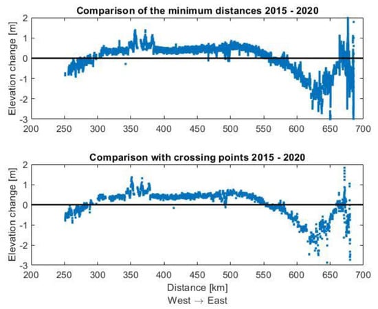 The elevation change produces very similar results with both methods (Figure 9). Statistical values such as the mean and median deviate only by 2–3 cm in selected sections. However, the method is not generally valid in this form. Only because of the known topography of the ice sheet with few slopes does it remain very reliable. However, it can be assumed that the error in the method of minimum distances is larger than in the method of the crossing point comparison.