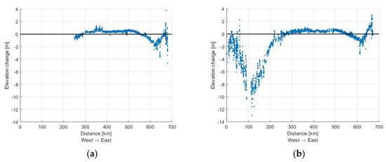 First, the elevation profiles are compared. These retain their rough but finer details, which can be seen when magnified (Figure 7). As expected, the ice elevation decrease is more pronounced along the coasts, which is enhanced by the two outlet glaciers Helheim (fastest flowing outlet glacier on the east coast of Greenland at approx. 30 m/d and Jakobshavn Isbræ (the most productive glacier on the west coast) since the expedition route lies within the influence of these [28]. However, when local ice elevation topography is considered, slight terrain elevations show a larger elevation change than the adjacent depressions (Figure 7). Overall, individual values fluctuate up to +/−30 cm per year around a sectionally stable mean or median.