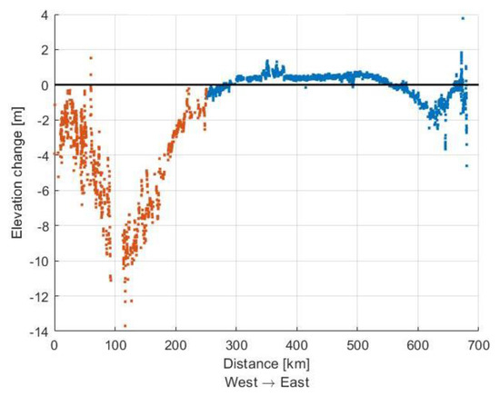 After PPP evaluation, the position accuracy is +/−3 cm, and the height accuracy is +/−5 cm for a single data set. For the investigations performed here, the elevation component is most relevant. Of course, there are some defined outliers; during measurement at these locations, a lower number of GNSS satellites occurred (PDOP). This influence is also visible in the dispersion of the elevation component (Figure 11, comparison km 680) around kilometer 680. This is classified as not trustworthy.
