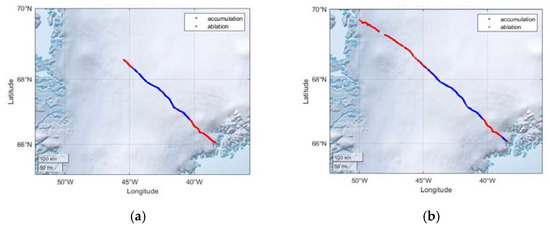 The data show accumulation and ablation along the profile (see Figure 13). As expected, there is accumulation in the central part of the ice sheet and ablation toward the coasts. It should be noted that the seasonal change shifts the equilibrium line. It also illustrates the influence of the Helheim Glacier and the Jakobshavn Isbræ, with a catchment area of up to 200 km inland. For comparison, the ice velocity in Greenland was determined in [17] by Sentinel-1. The extensive catchment areas of the glaciers in relation to the expedition route are shown in Figure 14.