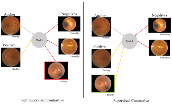 Contrastive learning aims to find similar and dissimilar patterns for a machine learning model. Using this approach, a machine learning model can be trained to distinguish between similar and dissimilar images and classify them. If there are not any labels or only weak labels for the images in the dataset, contrastive self-supervised learning [29], which can be effectively used to learn the data, is applied to build the model. If there are labels for all the images in the dataset, supervised contrastive learning is the proper method to build the model. The difference between contrastive self-supervised learning and supervised contrastive learning is shown in Figure 2. Contrastive self-supervised learning considers a single positive sample, such as an augmented version of the instance, and regards the remainder instances as negative samples. The model represents each instance in a unique and representative way. However, it may not be helpful enough for classification. Supervised contrastive learning considers not only the augmented version but also the instances from same class as positive samples, and the remainder constructs the negative set. This means the model represents the data into a feature space where instances from same class are closer than in contrastive self-supervised learning. Therefore, the model performs better in the classification problem.