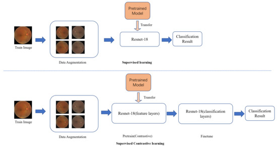 Deep learning has been widely used to build classification models for diabetic retinopathy. As shown in Table 1, the model includes binary classification or multiple classification. The binary classification model distinguishes the diabetic retinopathy images from the normal images. The multiple classification model classifies the images into five stages—normal, mild, moderate, severe, and proliferative diabetic retinopathy. Many popular deep neural networks, for example, AlexNet, VggNet, GoogleNet, and ResNet, have been applied to build classification models for diabetic retinopathy. In addition, some specifically designed networks, for example, Zoom-in-Net, BiRA-Net, CANet, and CABNet, have also achieved good performance for the classification of diabetic retinopathy. A weighted path convolutional neural network (WP-CNN) [18] was proposed to concatenate the convolutional outputs in different paths with weights. The WP-CNN enhanced the representation capacity of the deep neural network and improved the classification performance for diabetic retinopathy. Bodapati et al. [19] obtained a new state-of-the-art result for diabetic retinopathy severity level prediction on the Kaggle APTOS 2019 dataset. Tariq et al. [20] utilized deep transfer learning, including AlexNet, GoogleNet, Inception V4, Inception ResNet V2, and ResNeXt-50, for a five-degree classification of diabetic retinopathy. Chen et al. [21] proposed a novel preprocessing algorithm, including scaling, resizing, cropping, and augmenting, to enhance the quality of the fundus images and to achieve better performance of the diabetic retinopathy classification model. Nneji et al. [22] proposed a new deep learning network called WFDLN (weighted fusion deep learning network) to automatically extract features and build a classification model for diabetic retinopathy. Zoom-in-Net [23] was constructed to diagnose diabetic retinopathy. An attention mechanism was applied to focus on the key area and improve the model performance in the Zoom-in-Net. BiRA-Net [12], which combined the attention mechanism and a bilinear model, was applied to consider the influence of small objects in the fundus images on the classification model for diabetic retinopathy. A cross-disease attention network (CANet) [24] was proposed to jointly build a model for diabetic retinopathy and diabetic macular edema. The relationship between diabetic retinopathy and diabetic macular edema was explored and applied in the proposed model. A category attention block network (CABNet) [25] was used to treat the class imbalance problem in diabetic retinopathy. The discriminative features were extracted from each category of diabetic retinopathy. The attention mechanism has been widely used to extract the fine-grained features and improve the classification performance of diabetic retinopathy. However, contrastive learning, which can be used to improve the robustness of model, has not been applied to build a diabetic retinopathy classification model yet. In order to improve the robustness of the classification model, supervised contrastive learning method was applied to build a classification model for diabetic retinopathy.