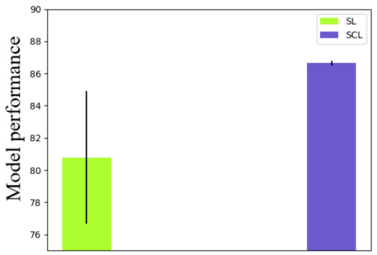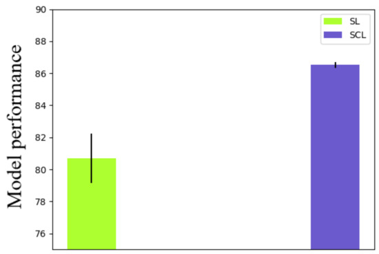 Further, we investigated the robustness of the method with different combinations of data augmentation methods. Random horizontal flip, random vertical flip, random rotation, and color jitter were elected. Nine kinds of combinations were applied to both the supervised learning (SL) and supervised contrastive learning (SCL). Details of the validation results are shown in Table 3 and Figure 6. As shown in Table 3 and Figure 6, besides the combination of methods, different rotation rates were also considered. The standard deviation of the SL was 1.53, while that of the SCL was 0.18. Therefore, the robustness of the SCL with different learning rates was better than the SL. Moreover, the mean accuracy of the SL was 80.68, while that of the SCL was 86.53. The SCL outperformed the SL again with different data augmentation methods.