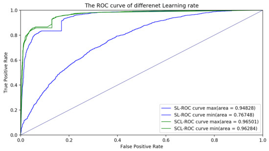 Firstly, we tested the robustness of the method with different learning rates. Nine different learning rates were applied to both the supervised learning (SL) and supervised contrastive learning (SCL). Details of the validation results are shown in Table 2 and Figure 4. As shown in Table 2 and Figure 4, the standard deviation of the SL was 4.11, while that of the SCL was 0.15. Therefore, the robustness of the SCL with different learning rates was better than the SL. Moreover, the mean accuracy of the SL was 80.79, while that of the SCL was 86.64. The SCL was more stable and had better performance than the SL with different learning rates. Additionally, other learning rates such as 0.3, 0.5, or 0.00001 were also tested. However, the models had either overfitting or underfitting. Therefore, the results of these learning rates were not considered in robustness measurement. The receiver operator characteristic (ROC) curve was plotted to comprehensively evaluate the performance of these classification models. The ROC curve showed the tradeoff between the sensitivity (true positive rate) and the specificity (1-false positive rate). The classification model that had a curve closer to the top-left corner indicated a better performance. In order to compare the different classification models, the area under the ROC curve (AUC), which summarizes the performance of curve into a single value, was proposed. The results of the ROC curves and AUC values in Figure 5 indicate that the classification model with the SCL was more robust and powerful than the classification model with the SL for different learning rates. For a given threshold, the sensitivity and specificity of the model can be calculated. The sensitivity of the SL for different learning rates was , while that for the SCL, for different learning rates, was . The specificity of the SL for different learning rates was , while that for the SCL, for different learning rates, was .
