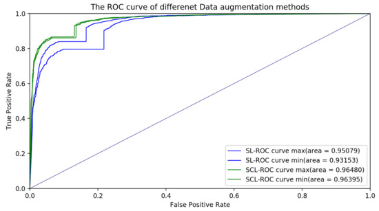 We also plotted the ROC curves and AUC values for the classification models with the SCL and SL for different data augmentation methods in Figure 7. The testing results indicated that the classification model with the SCL was better than the classification model with the SL. For a given threshold, the sensitivity and specificity of the model can be calculated. The sensitivity of the SL for the different data augmentation methods was , while that of the SCL for the different data augmentation methods was . The specificity of the SL for the different data augmentation methods is , while that of the SCL for the different data augmentation methods was .