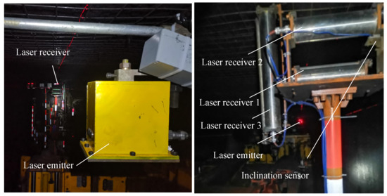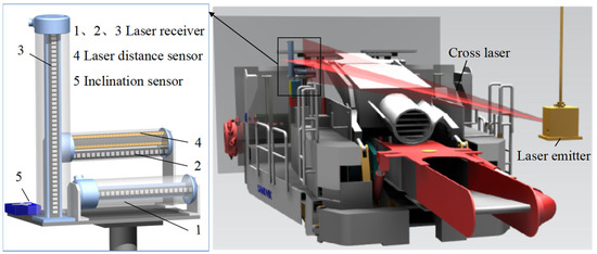 The pose detection subsystem is composed of a laser emitter, three laser receivers, a laser ranging sensor, a biaxial tilt sensor and an industrial computer, as shown in Figure 1. The transverse laser emitter is arranged on the top of the tunnel, and the laser receiver, distance measuring sensor and tilt sensor are arranged on the roadheader body. The position coordinates of the spot projected on the laser receiver will also change accordingly when the roadheader is twisted or moved. The change of the spot coordinates is detected by the laser receiver and sent to the industrial computer as the data source for pose calculation.