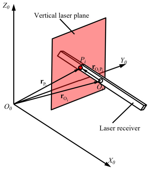 O0X0Y0Z0 is the reference coordinate system; point O is the center of the laser receiver; point P is the center of the laser spot and rO and rP are the coordinate vectors corresponding to point O and point P, respectively. They are also the relative coordinate vectors from point O to point according to the vector algorithm: