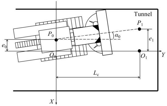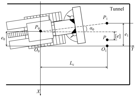 As shown in Figure 3, O0 is the starting point of the roadheader in the ideal state, O1 is the endpoint of the roadheader in the ideal state, located on the Y axis, and its y coordinate is the distance of the driving footage of each cycle. P0 is the actual starting point, that is, the current position of the roadheader; α0 is the yaw angle of the roadheader at the starting point and e0 is the deviation of the body position of the roadheader at the starting point. Furthermore, P1 is the endpoint predicted according to the pose of the roadheader at the starting point; e1 is the deviation of the prediction point and Lc is the driving cycle footage.