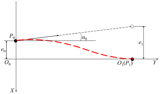 While e1 > e0 indicates that the position deviation of the roadheader continues to increase, |e0| > [e] indicates that the deviation of the anchor point of the windlass at the anchor point is large, which is not suitable for eliminating the lateral deviation of the roadheader in a driving cycle. If the maximum allowable adjustment amount in a single cycle is [e], then the coordinate of the trajectory endpoint P1 is (e1 ± [e], Lc). When e1 is greater than zero, the negative sign is taken and when e1 is less than zero, the positive sign is taken, as shown in Figure 5.