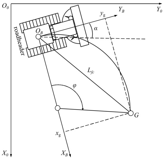 It must be established that the coordinate system XBOBYB is attached to the roadheader, and the YB axis is consistent with the movement direction. The instantaneous center is always located on the XB axis in the roadheader coordinate system. According to the pure tracking control strategy, the curvature of the roadheader at the current position is equal to the radius of the fitting arc from the current point to the target point, and the distance from the target point to the current point becomes the preview distance [31]. The arc is a tangent to the YB axis, so the coordinates of the target point in the roadheader body coordinate system can be calculated by the following formula: