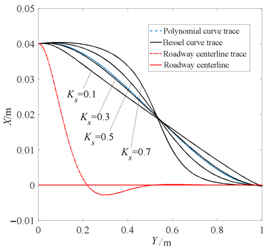 When the planning path is a Bezier curve or polynomial curve, the tracking is relatively smooth. By adjusting the shape coefficient Ks of a Bezier curve from 0.1 to 0.7, the shape of the tracking track will change accordingly. The smaller the shape coefficient, the larger the curvature of the tracking at the starting point and the endpoint, and the smaller the curvature in the middle. On the contrary, the larger the shape coefficient, the smaller the curvature of the trajectory at the start and endpoints, and the larger the curvature in the middle.
