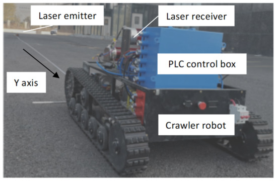 This involves arranging a laser emitter at the starting point to provide a reference and installing the laser receiver, tilt sensor, distance measuring sensor and controller, etc., on the crawler, as shown in Figure 14.