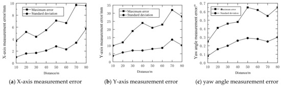 Within the range of 10–80 m, the X-axis coordinate measurement error generally increases with the increase in distance, the standard deviation of error is between 1–6 mm, and the maximum error is between 3–10 mm. The Y-axis coordinate measurement error generally increases with the increase in distance, the standard deviation of error is between 4–14 mm, and the maximum error is between 10–32 mm. The measurement error of yaw angle does not obviously change with distance. The standard deviation of error is between 0.1–0.3°, and the maximum error is between 0.25–0.65°.