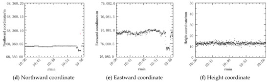 The northeast celestial coordinate system is adopted in the mining area to indicate the direction of the roadheader. The reference system (navigation coordinate system) is defined as the X-axis representing the east, the Y-axis representing the north and the Z-axis representing the sky. The XB axis of the roadheader coordinate system refers to the right side of the roadheader, the YB axis refers to the forward direction and the ZB axis refers to the upper side. The yaw angle is zero when the YB axis of the roadheader points north. The heading direction of the tunnel is due west. Figure 17 is the monitoring data of the pose parameters of the excavation roadheader in a certain period of time.