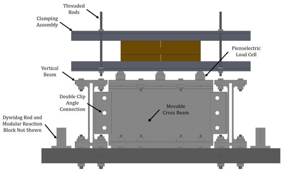 The supporting reaction frame, shown in Figure 5 and Figure 6, is a three-point flexural testing fixture that provides supports for the specimen and clamps it in a vertical orientation. The reaction frame is divided into an upper and a lower support frame. Two discrete frames were designed to prevent visual obstruction of a specimen’s response to an impact. The reaction frame beams are designed with slotted holes to enable the adjustment of the specimen length by moving the cross beams. Four built-up beams act as guides and supports to the cross beams.