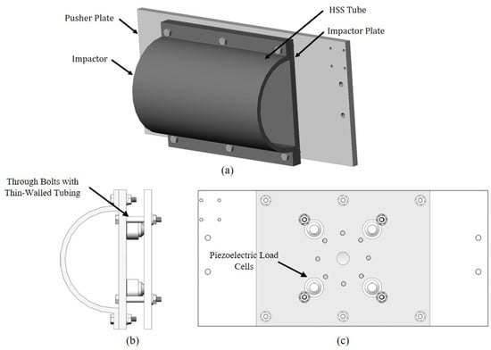 Four piezoelectric dynamic force sensors were mounted to the impactor plate. The impactor and load cells were connected to the actuator pusher plate using four through-bolts with thin-walled tubing to reduce friction and catching of the threads. The thin-walled tubing extended the length of the bolt shank and threading, so as the impactor struck a specimen, the load cells were compressed between the impactor plate and the pusher plate, causing each of the plates to slide along the bolt shank or threading. The force sensors were preloaded with approximately 2000 lbf (8.9 kN) to 6500 lbf (29 kN) on average. Preloading ensured that each load cell received equal loading from an impact and eliminated delay in load cell response due to excess space. Preloading also served to maintain the impactor level and motion rigid.