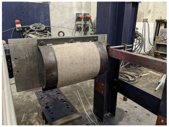 The impactor assembly, shown in Figure 8 and Figure 9, was fabricated with a rounded face to reduce high-stress concentrations caused by a concentrated center-point load. Concentrated loads have been shown to affect the shear deformation of CLT in the area of the load, thereby changing the longitudinal strain [21,29]. The impactor is half of a large diameter, ASTM A500 Gr.B, steel structural tube section, HSS10.75×0.5, fastened to ASTM A36 plates. A 0.5 in thick firm felt type F5 programmer is adhered to the impactor’s face. The radius of the impactor was selected to achieve a radius-to-CLT-lamella-thickness ratio of 4 (i.e., 5.375 in/1.375 in). The radius of the impactor conforms to the recommendations of ASTM D198, radius of curvature 2-to-4 times the depth, and Hou [30], radius of curvature 2.5-to-3 times the depth. The impactor mass is 111.52 lbs (50.46 kg).