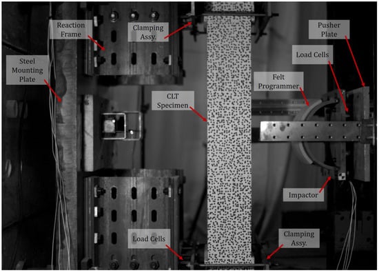 The goal of this research was to develop an experiment to study shear modes of failure in impulsively loaded CLT. A testing system and methodology were developed to investigate the behavior of low-span-to-depth ratio Spruce–Pine–Fir–South (SPFS) CLT panels subjected to impulsive loading in a center-point bending loading condition. A test series was designed to subject CLT panels to a variety of impulses in a loading condition that would promote shear modes of failure. Impact impulses were varied to permit the observation of varied levels of damage ranging from elastic and inelastic to complete failure. In situ residual capacity tests were conducted to qualify and quantify damage in CLT panels and quantify changes in residual mechanical properties following impulsive loading. Section 2 describes the design and function of the testing system, as well as the preparation of specimens tested. The results of the impulsive tests are described in Section 3. Conclusions are summarized in Section 4.