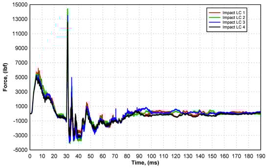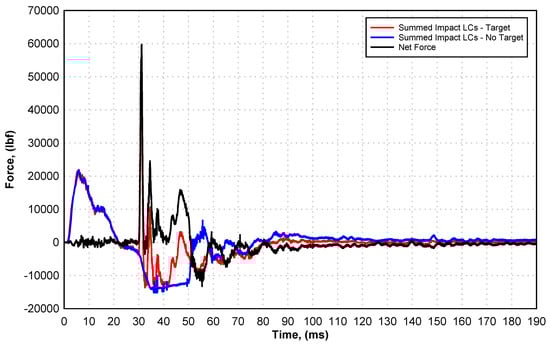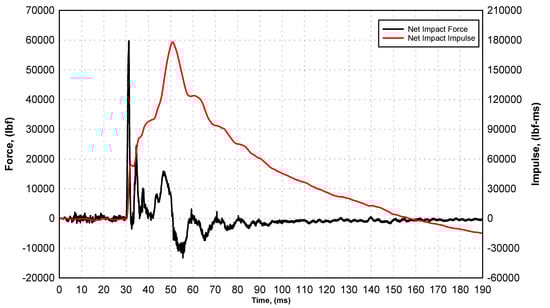 The four piezoelectric loads fastened to the impactor assembly were used to determine the impulsive loading applied to each specimen. Two tests were conducted for each specimen, a test with impact and a test with no impact, i.e., a dry-fire test. The force histories for each load cell are summed, and the difference between the sums is taken to determine the net force history applied (Equation (2)).