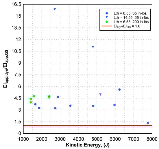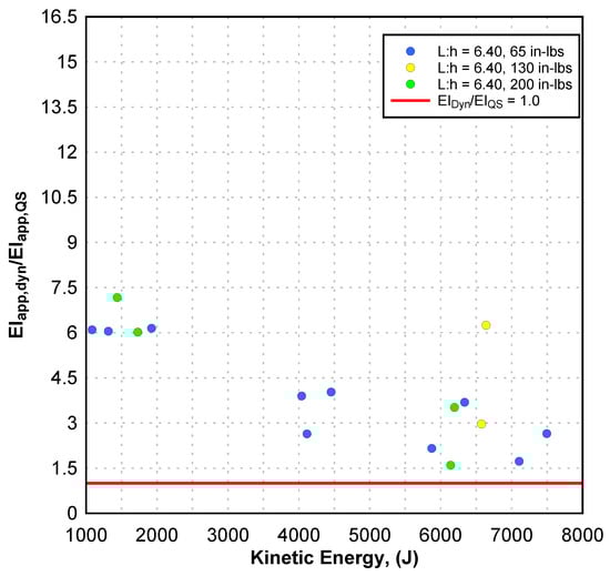The effect of impulsive loading on CLT panels was studied by evaluating changes to their mechanical properties and characterizing damage caused in relation to variations in rotational rigidity at the boundary conditions and impact energy. The dynamic apparent flexural stiffness, , was determined for each specimen by taking the slope of the linear, pre-peak region of the resistance function. Additionally, a high-speed video was reviewed to ensure that no visible damage had initiated in each specimen prior to the development of the peak impact force. A ratio, was used to compare the dynamic apparent flexural stiffness to the average apparent flexural stiffness for quasi-statically loaded specimens, . The experiments showed a significant increase in dynamic apparent flexural stiffness in both three- and five-laminae specimens (Figure 16 and Figure 17).
